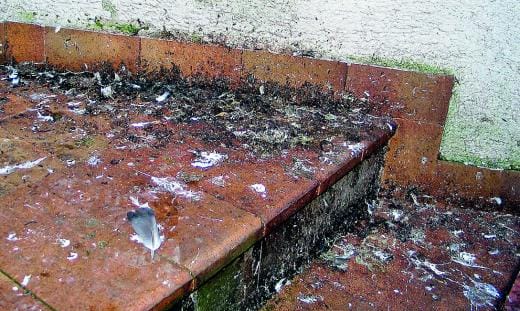 Unterhalb der Rast- bzw. Brutplätze von verwilderten Stadttauben können sich große Kotmengen ansammeln.
