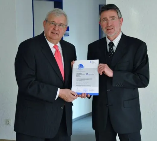 Freude über den erfolgreichen Arbeitsschutz: Dr. Klaus Wehmeyer (VBG; re.) überreicht Inhaber Jürgen Gülich das AMS-Zertifikat. - © Gülich