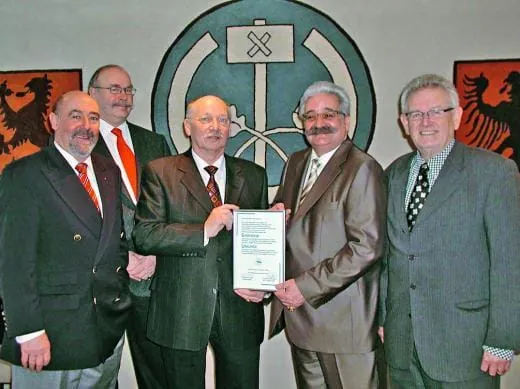 Obermeister Gerhard Kullik, stv. Obermeister Walter Schneider sowie der erste Ehrenringträger, Friedrich Wilhelm Müller aus Lippstadt, überreichten den goldenen Ehrenring, der das Logo des Geebäudereiniger-Handwerks trägt, sowie eine Ehrenurkunde. Peter Burmann, Kreishandwerksmeister der Kreishandwerkerschaft Dortmund und Lünen, ließ es sich ebenfalls nicht nehmen, zu gratulieren.