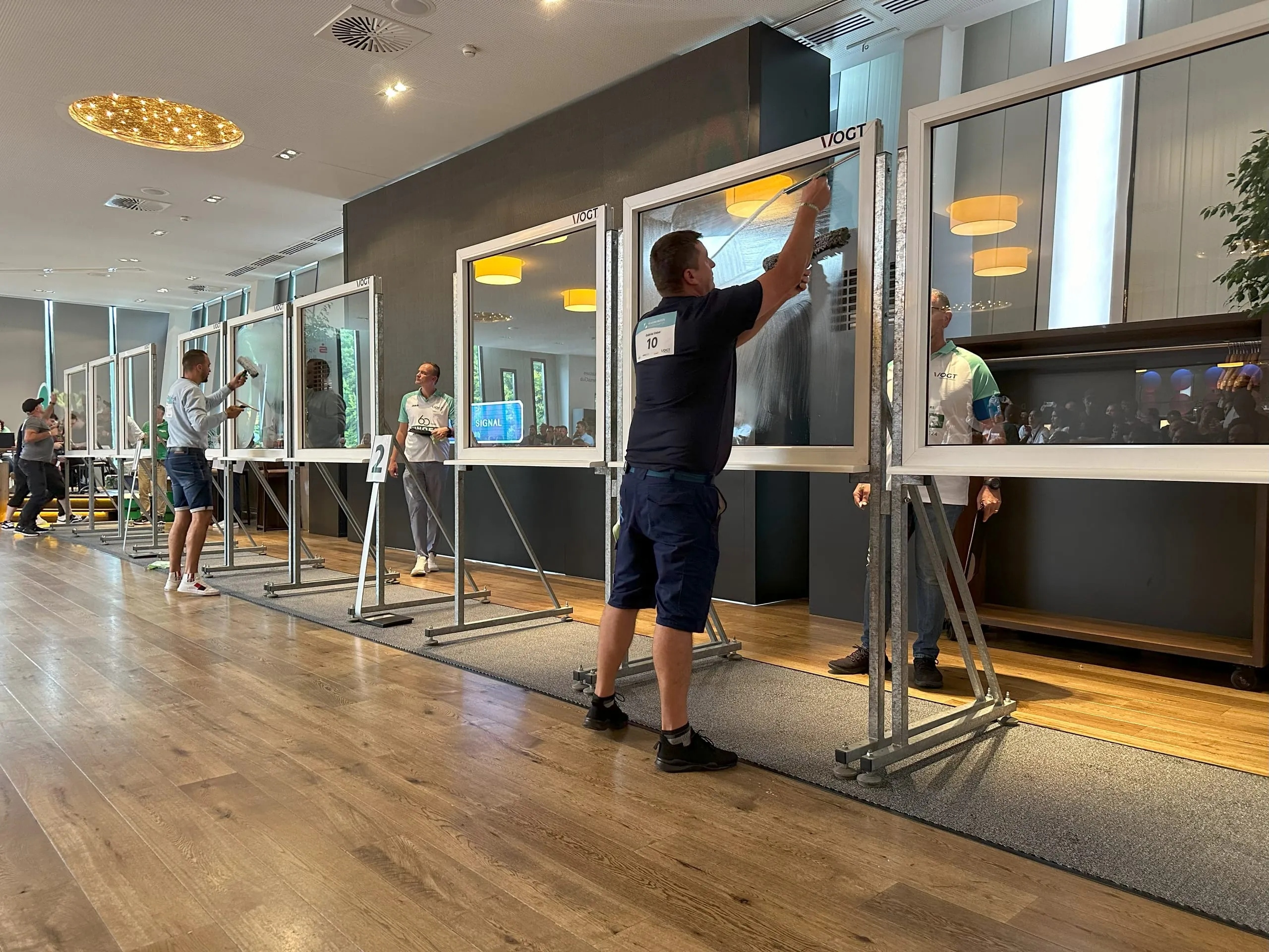 Zu dem Wettbewerb traten 49 Gebäudereiniger und zwei Gebäudereinigerinnen aus dem ganzen Bundesgebiet an. Ihre Aufgabe bestand darin, jeweils drei Fenster mit den Maßen 1040 x 1153 Millimeter zunächst vollflächig mit dem Einwascher einzuwaschen und anschließend mit dem Fensterwischer abzuziehen. Wer kein eigenes Werkzeug mitgebracht hatte, dem stellte der Vogt-Partner Unger das nötige Equipment zur Verfügung.