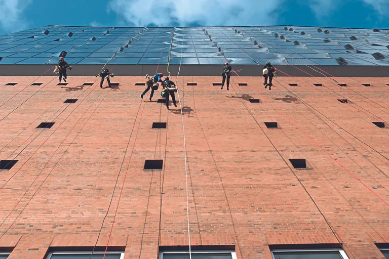 Seit sechs Jahren reinigt sein Unternehmen in Zusammenarbeit mit den Industriekletterern der 3ker Ras Group aus Berlin die Fassade von Hamburgs berühmtem Konzerthaus. In den ersten drei Jahren wurden die beiden Unternehmen dabei von Arbeitssicherheitskontrolleuren begleitet, die das erstellte Sicherheitskonzept täglich überprüften und bei Bedarf Anpassungen vornahmen. Inzwischen ist längst Routine eingekehrt, denn die Elbphilharmonie wird stets von demselben eingespielten Team bearbeitet.