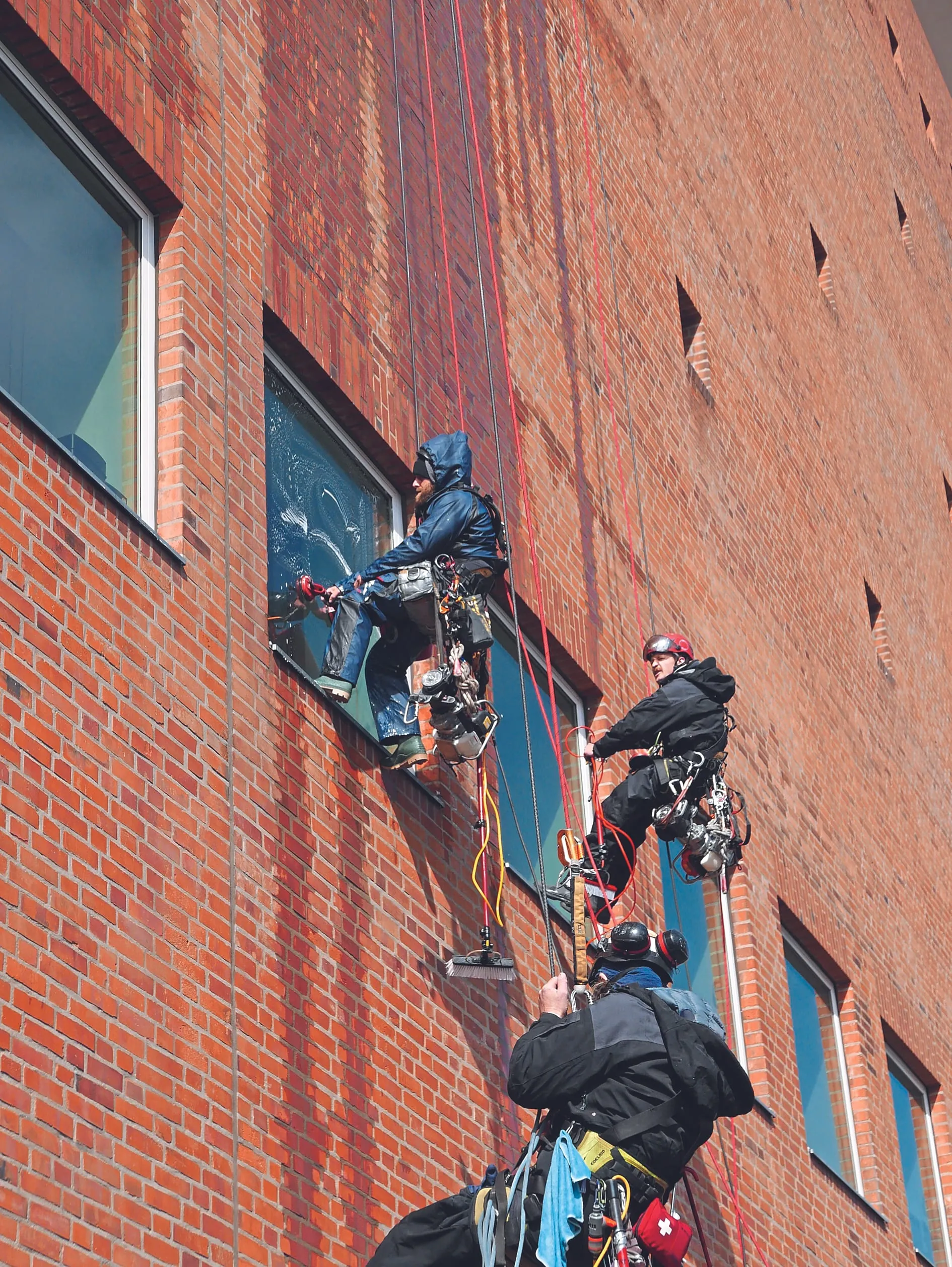 Beim Abstieg waren dann alle Glasscheiben sowie die Fenster der im alten Speicher befindlichen Verwaltungsräume zu reinigen. Die Kletterer waren daher nicht nur mit Teleskopstange und weichem Bürstenaufsatz, sondern auch mit einem Notizblock und einer Kamera sowie einem Fensterreinigungsset ausgerüstet. Dazu kam ein Glassauger, der mehr Stabilität bei plötzlich aufkommenden Windböen bietet. Zusammen mit dem eigenen Klettergeschirr, einem wasserdichten Overall und Sicherheitsgummistiefeln, dem Sitzbrett sowie der Motorwinde haben die Abseiler damit etwa 10 bis 15 kg am Mann.