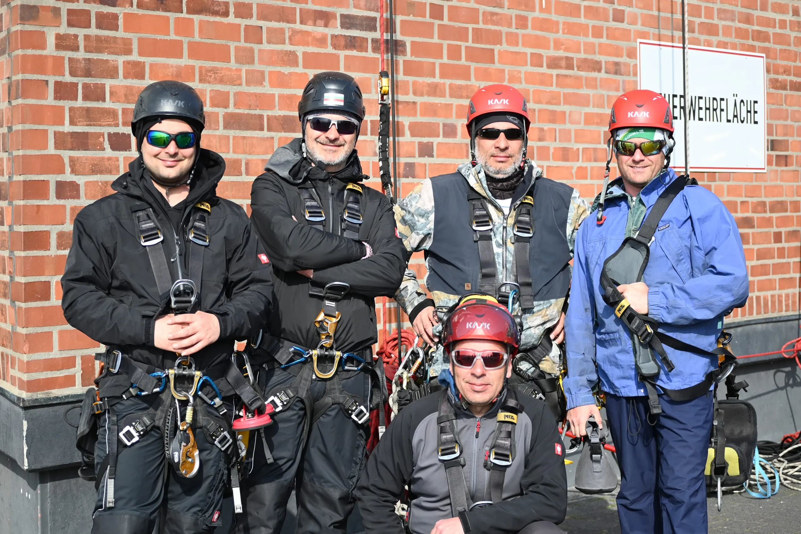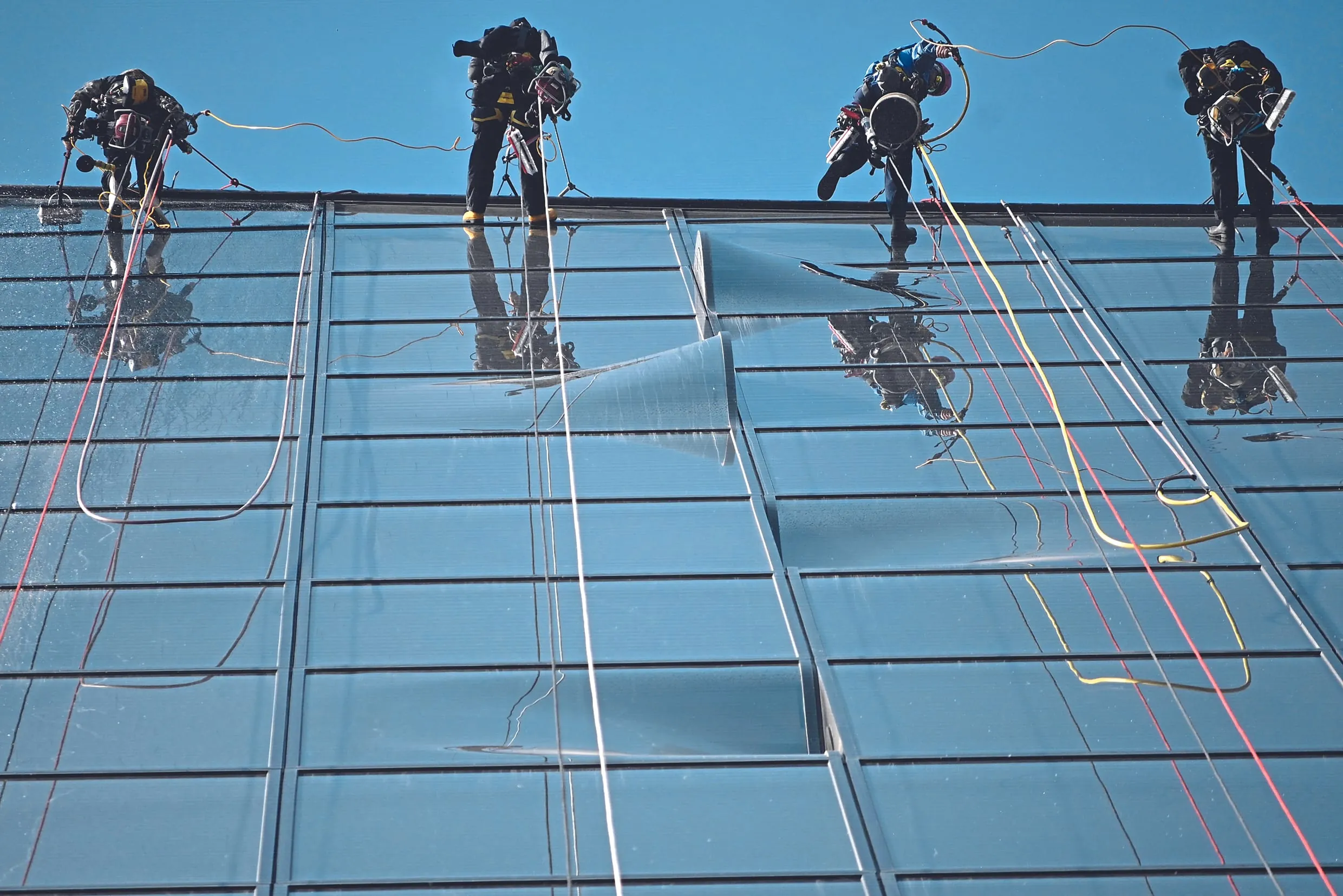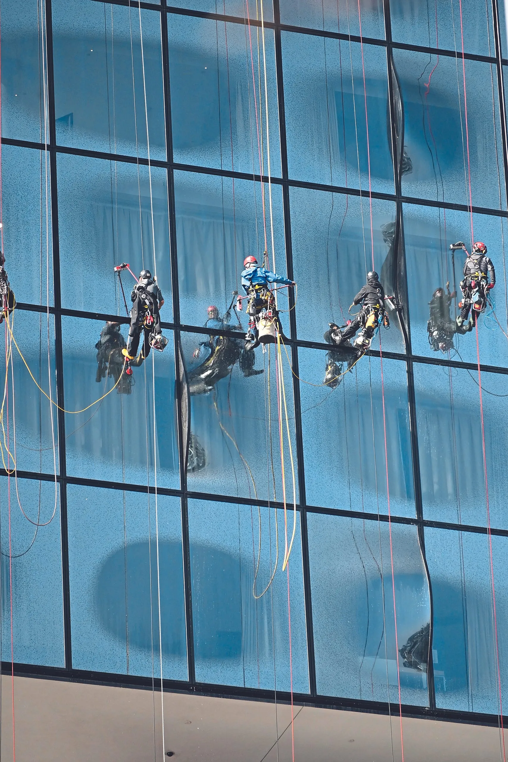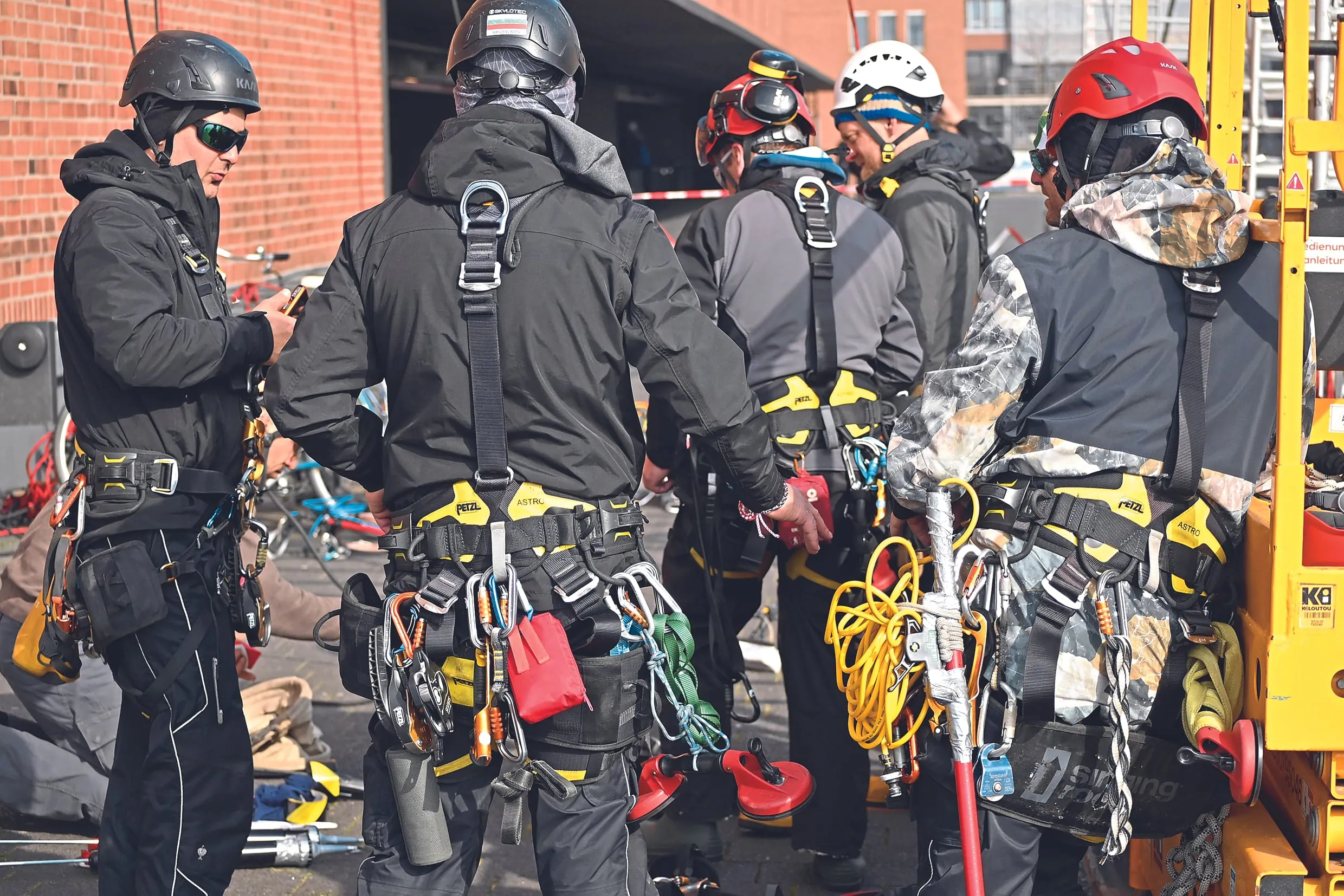 Unterstützt werden die Teams durch je einen Mann im Publikumsbereich und auf dem Dach des Gebäudes. Am Boden hat der Kollege die Aufgabe, verhedderte Seile wieder zu lösen, Neugierige aus dem Gefahrenbereich zu verscheuchen und gegebenenfalls Seile nachzuspannen. Der Mitarbeiter auf dem Dach hilft hingegen bei den Vorbereitungen zum Abseilen – etwa beim Anschließen der Osmosewasserversorgung, dem Umhängen der Seile und der Motorwinde, mit denen sich die Mitarbeiter am Gebäude nach oben ziehen lassen.