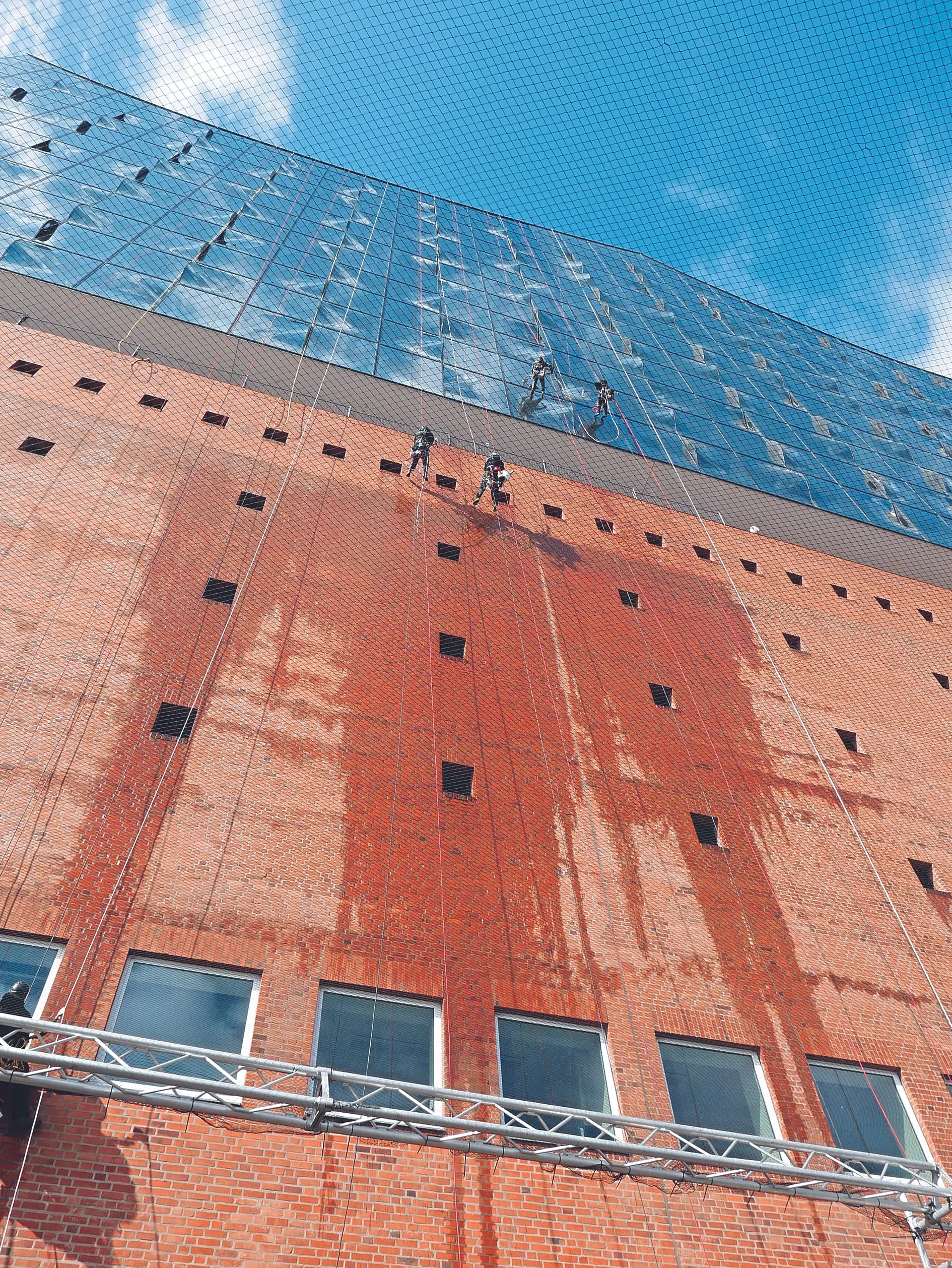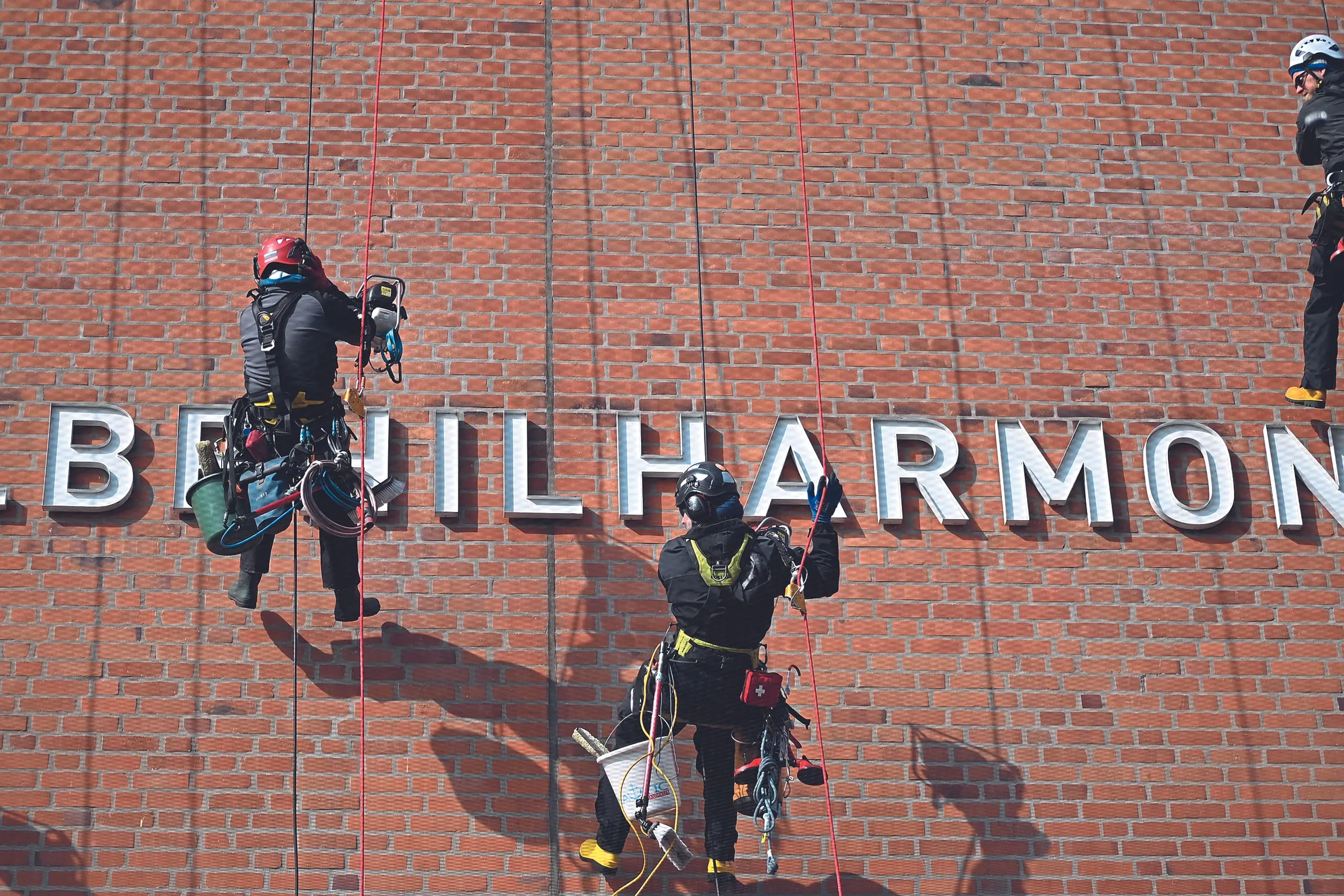 Während der ersten Tage wird daher auch ein Ponton auf dem direkt an das Konzerthaus angrenzenden Fleet verankert. Auf diesem wird anschließend ein Gerüst als Aufstiegshilfe montiert. Und weil die Kletterer nicht zum Ponton schwimmen können, sorgt die Fährgesellschaft auch für das Übersetzen der Mitarbeiter, so lange sie den zur Waterkant gelegenen Fassadenbereich reinigen. Bei aller Vorbereitung muss auch das Wetter berücksichtigt werden. Bis Windstärke 5 können die Abseiler arbeiten, darüber hinausgehende Windstärken sind – ebenso wie Stark- und Dauerregen, Schnee oder Gewitter – für die Beschäftigten zu gefährlich.