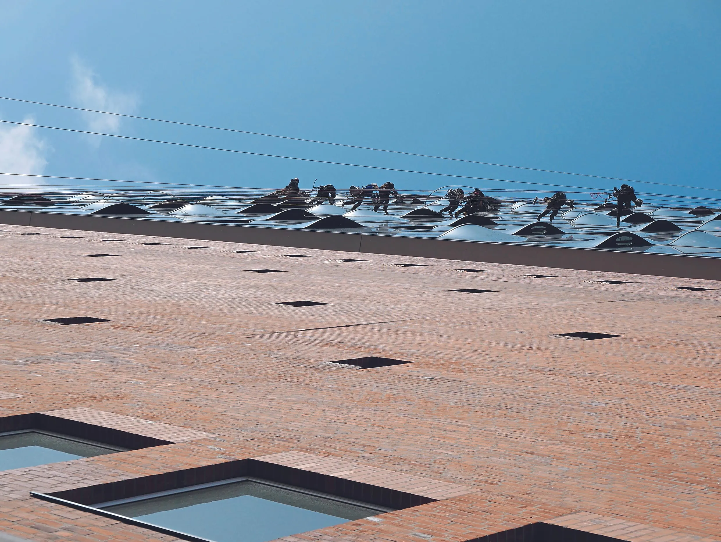 Am Aufbaumontag wird auch die Osmoseanlage aufgestellt. Sie muss dazu in die 26. Etage der Elbphilharmonie transportiert und von dort durch den Wohnbereich auf das Dach der Elbphilharmonie gebracht werden. Diese Arbeit – wie auch alle anderen Tätigkeiten auf dem Dach des Konzerthauses – dürfen nur durch die Abseiler vorgenommen werden. Um sie gegen Absturzgefahren zu schützen, wurde daher entlang der Dachkante ein Taurus-Umlaufschienensystem von Innotech (Kirchham, Österreich) montiert. Darauf bewegen sich Gleiter, die als bewegliche Anschlagspunkte dienen. In diesen hängen sich die Kletterer ein und können sich so im gesamten Schienenverlauf ungehindert bewegen. Dadurch gelangen sie sicher zu allen wichtigen Punkten auf dem Dach, insbesondere zum Schlauchsystem für die Versorgung der Reinigungskräfte mit Osmosewasser. Es wurde vor zwei Jahren fest verlegt und versieht sämtliche Bereiche des Dachs mit Anschlüssen, an denen sich die Fensterreiniger andocken können. Bevor die Reinigungsarbeiten begonnen werden, müssen jedoch sämtliche Schlauchleitungen geleert und gespült werden, damit eine einwandfreie Funktion des Systems gewährleistet ist.
