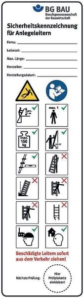 Die Prüfung der Leitern ist ebenfalls aus den Anforderungen der Betriebssicherheitsverordnung abzuleiten. Vor jeder Verwendung ist die Leiter fachkundig durch Inaugenscheinnahme auf offensichtliche Mängel zu kontrollieren. Werden Leitern hohen mechanischen Beanspruchungen ausgesetzt, wie es auf Baustellen immer der Fall ist, sind sie darüber hinaus regelmäßig mindestens jährlich zu prüfen. Diese Prüfung muss im Leiterbuch dokumentiert werden. Die BG Bau bietet Aufkleber zur Kennzeichnung der geprüften Leitern an. Werden sicherheitsrelevante Mängel festgestellt – etwa angebrochene Wangen oder Stufen –, dürfen die Leitern nicht mehr verwendet werden.