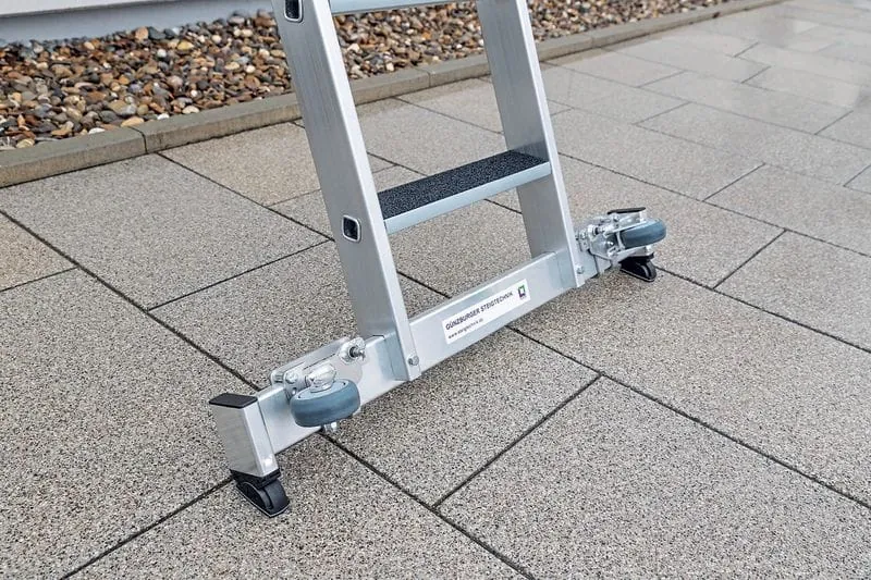 Um einen ergonomischen Transport der Leiter von einem Standort zum nächsten zu gewährleisten, sind Rollen an der Traverse (Fußverbreiterung) einer Stufen-Glasreinigerleiter sinnvoll. Dadurch kann der Mitarbeiter die Leiter hinter sich herziehen und sicher und schnell versetzen.