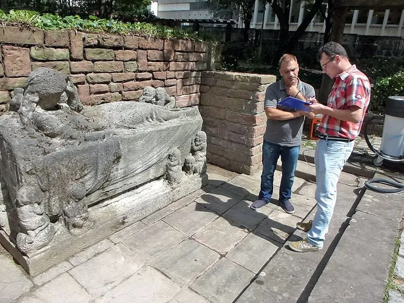 Ercan Yalcinkaya von Wackenhut Gebäudeservice brachte gleich drei Denkmäler wieder auf Hochglanz – die Karyatide, die Börnegedenktafel und Torso 2. Die Karyatide befindet sich am Rande eines Sees. Hier war es daher besonders wichtig, dass ohne Chemie gearbeitet wurde. Mit dem Hochdruckreiniger ließen sich die Hinterlassenschaften der Vögel problemlos beseitigen.