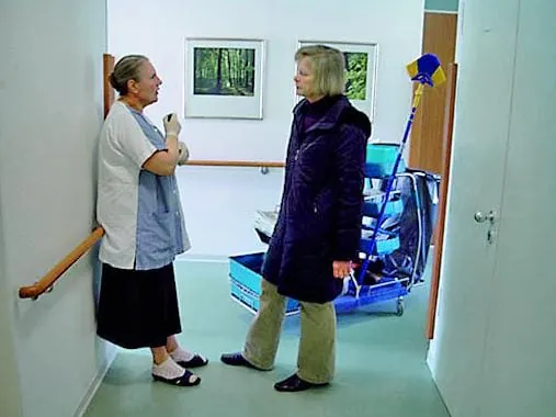 Pflegedienstbereiche, Krankenstationen und Sanitäreinrichtungen sind, auch im Hinblick auf MRSA, in die tägliche, fachgerechte Reinigung eingebunden. Dazu sind die Mitarbeiter der Gebäudereinigung Schulz mit indivduell einsetzbaren Reinigungswagen (Wetrok Smartcar) ausgestattet. So sind alle Mitarbeiter bei allen Reinigungsaufgaben im Objekt für jede Situation gerüstet – alles, was sie auf ihrer täglichen Reinigungstour benötigt, haben sie schnell zur Hand. Und selbst, wenn viele unterschiedliche Reinigungsgeräte und Reinigungsuntensilien mitführt werden, alles hat seinen festen Platz auf dem Wagen. Ob WC-Reiniger oder Microfasertücher, ob Staubsauger oder Nasswischeinheit - auf dem Wagen ist immer übersichtliche Ordnung, und das Reinigungspersonal somit immer in der Lage, eine fachgerechte Systemreinigung auszuführen. Hygienische Wohlfühlreinigung, wie die Gebäudereinigung Schulz ihre Leistung nennt, beginnt nach Meinung der verantwortlichen Objektleiterin Nikula bei der richtigen Ausstattung – erst dann können die motivierten Mitarbeiter ihre fachliche Kompetenz ausspielen, um das gewünschte Reinigungsergebnis zu erzielen.