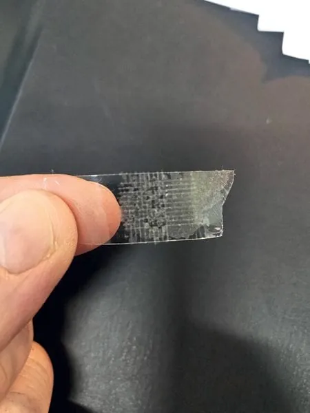 Im vorliegenden Beispiel soll geprüft werden, ob die aufgetragene Beschichtung auf einem Linoleum hält. Dabei wurden drei Schichten auf dem Linoleum aufgetragen. Mit dem Gitterschnittprüfer werden nunmehr zwei Schnitte durchgeführt, so dass ein rechtwinkeliges Kreuz als Schnittmuster entsteht. In dem Bereich wird nunmehr ein Klebestreifen aufgebracht, um die Haftfestigkeit überprüfen und bewerten zu können. Wie auf dem letzten Bild deutlich zu erkennen ist, war keine Haftung vorhanden, so dass die Beschichtung entfernt wurde.