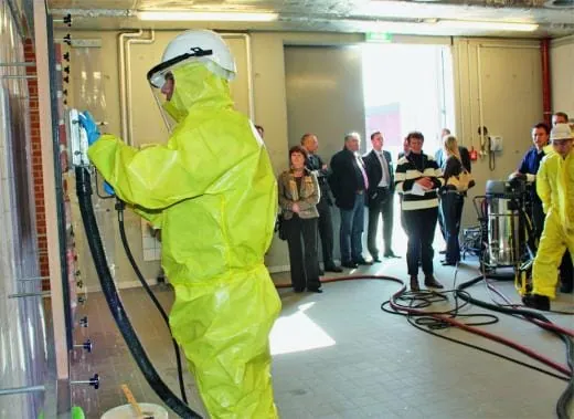 Auf einem anschließenden Rundgang durch die unterschiedlichen Seminarräume konnte sich der Staatsrat Frigge ebenso wie alle anderen Gäste und Besucher von den vielen Facetten des Gebäudereinigerberufes ein Bild machen. Unterstützt durch die Ausbildungsleiterin Anne Blanken-Schäfer gab Obermeister Katzer dem Staatsrat einen Überblick über die Vielseitigkeit der Ausbildung. Von Fachkräften und Auszubildenden demonstriert sahen die Gäste und Besucher die Küchen- und Krankenhausreinigung, Schädlingsbekämpfung, Graffitientfernung und weitere Lehrinhalte.