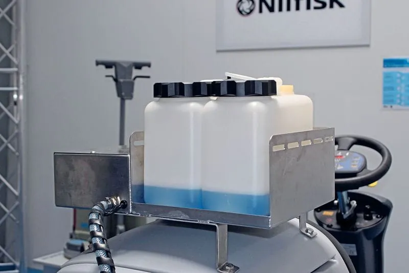 Infolgedessen entwickelte das deutsche Projektteam des Maschinenherstellers unter der Federführung von Keller gemeinsam mit Kai Deckenbach, Techniker im Special Application Center von Nilfisk, eine praktikable und effektive Lösung, um große Bodenflächen in nur einem Reinigungsdurchgang zu schrubben, zu trocknen und gleichzeitig zu desinfizieren. Ergebnis der Sonderanfertigung ist eine neue Desinfektionseinheit, welche als optionales Anbaugerät für Aufsitz- Scheuersaugmaschinen (BR652/752 und BR755/855 sowie auf Anfrage für andere Modelle) eingesetzt werden kann.