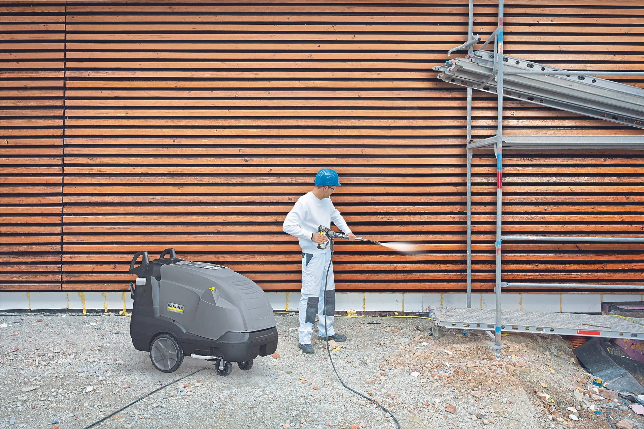 Holz ist eine der ältesten Bausubstanzen der Welt und bis heute für die Gestaltung von Fassaden beliebt. Unbehandeltes Holz allerdings zeigt recht schnell eine uneinheitliche Optik, sodass eine Reinigung erforderlich wird. Holz reagiert auf zu hohe Mechanik empfindlich, weshalb Heißwasserhochdruck eine schonende, effiziente Lösung ist: Die hohen Temperaturen lösen den Schmutz, sodass sich der Aufpralldruck abhängig von verschiedenen Parametern nahezu auf null reduzieren lässt.