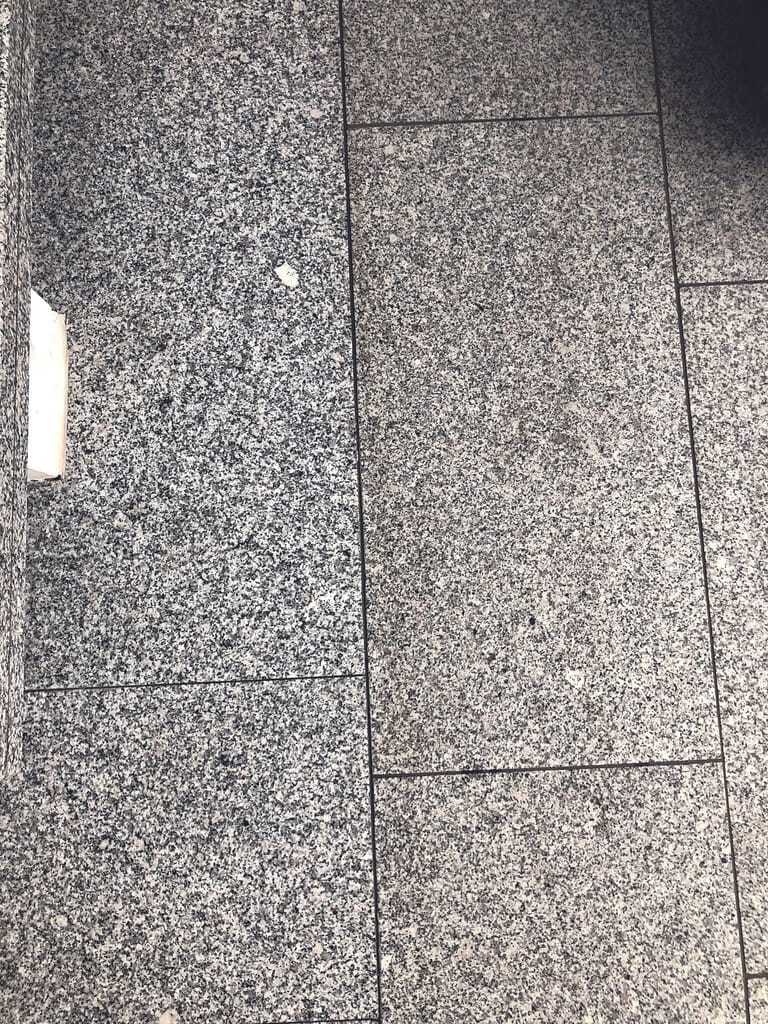 Vor dem Anlegen der Musterfläche galt es, den Naturstein zu bestimmen, um nicht durch die Wahl eines falschen Reinigungsmittels eine unerwünschte Reaktion herbeizuführen. Bei Betrachtung der Oberfläche konnte man deutlich erkennen, dass der Stein eine gleichmäßige Maserung und drei Farben aufwies. Des Weiteren konnte der Stein mit einem Cuttermesser nicht eingeritzt werden, zudem reagierte die Oberfläche bei der Probe an einer verdeckten Stelle nicht auf ein säurehaltiges Reinigungsmittel. Zusammengenommen wies alles auf einen Granit hin.