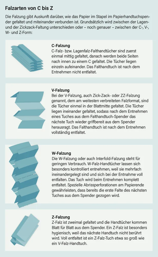 Weitere Vorteile, die für Papierhandtücher im Gegensatz zu Händetrocknungssystemen sprechen: Es bilden sich keine nassen, potenziell rutschigen Stellen auf dem Boden. Die Hände lassen sich sehr schnell trocknen und die Umgebungsluft wird nicht kontaminiert. Darüber hinaus unterscheidet sich die Qualität eines Papierhandtuchs vorrangig in der Anzahl an Papierlagen: In der Regel werden ein-, zwei- oder dreilagige Varianten angeboten. Je mehr Lagen ein Papierhandtuch aufweist, desto reißfester ist es. Außerdem bestehen Einmalhandtücher aus unterschiedlichen Materialien: So sind beispielsweise Ausführungen aus saugfähigem Hygienepapier aus Zellstoff verfügbar. Umweltfreundliche Papierhandtücher werden hingegen aus Recyclingpapier gefertigt.