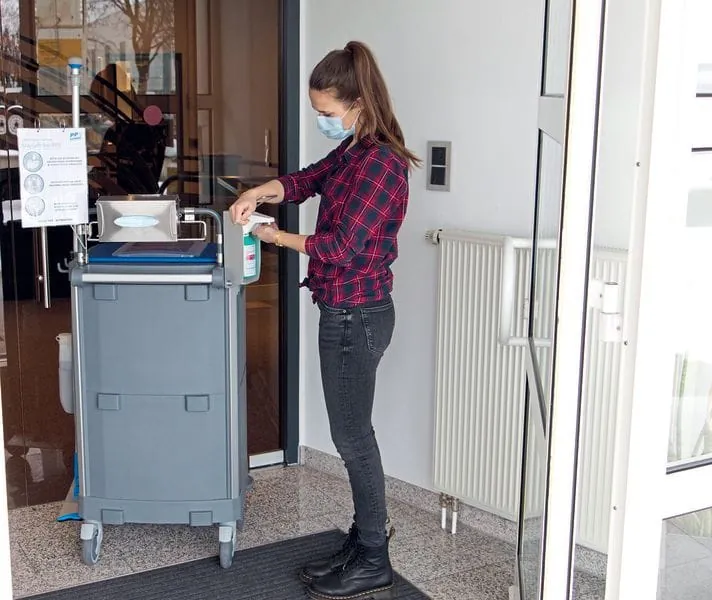 Pfennig Reinigungstechnik erweitert mit dem Hygieneturm Caro XT sein Wagensegment um ein wichtiges Hilfsmittel zum Schutz von Besuchern und Mitarbeitern in Unternehmen. Mit der Möglichkeit zur Befestigung aller wichtigen Hygiene-Komponenten, wie Masken- und Desinfektionsmittelspender, eigne sich der Hygieneturm optimal zum Einsatz in Eingangsbereichen.