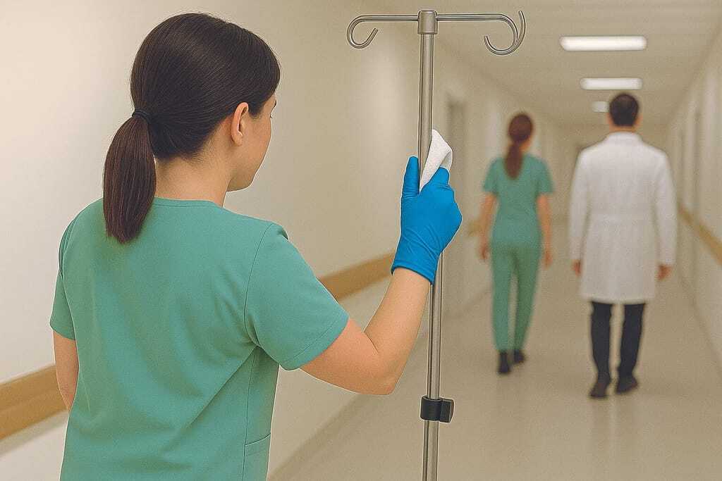 Die Reinigung und Desinfektion mobiler Geräte im Gesundheitswesen wie Infusionspumpen und -ständer, Toilettenstühle oder auch Nachtschränke durch Pflegepersonal ist eine weitverbreitete Praxis, führt aber unter anderem aufgrund von Zeitmangel häufig zu mangelhafter Sauberkeit und Hygiene. Wie professionelle Reinigungsdienstleister für Entlastung sorgen können.