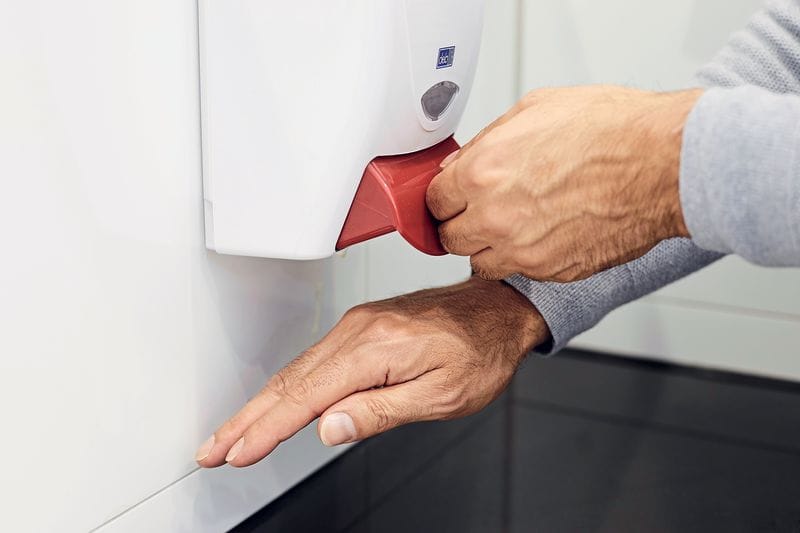 Oberste Prämisse, um Schmierinfektionen zu vermeiden, ist konsequente Handhygiene. Nach der Berührung anderer Personen sollten sich Menschen daher die Hände waschen oder desinfizieren. Um die Haut dabei so wenig wie möglich zu belasten, empfiehlt SC Johnson Professional den Einsatz hautschonender Schaumhandreiniger wie Clear Foam Pure oder die Hand­desinfektionsmittel InstantFoam Complete und InstantGel Complete.