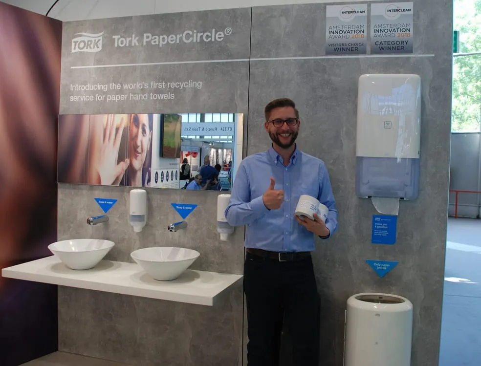 Der Tork Paper Circle von Essity, Sieger in der Kategorie Management und Schulungslösungen, ist ein Recyclingservice für Papierhandtücher. Mit Fachpartnern baut Essity den Service vor Ort auf und trägt dazu bei, den CO2-Fußabdruck von Papierhandtüchern um 40 Prozent senken. Beeindruckt war die Jury auch von Investitionen des Unternehmens mit dem Ziel, Verhaltensänderungen zu erreichen und die Waschraumbenutzer dazu anzuregen, die gebrauchten Handtücher im richtigen Behälter zu entsorgen.