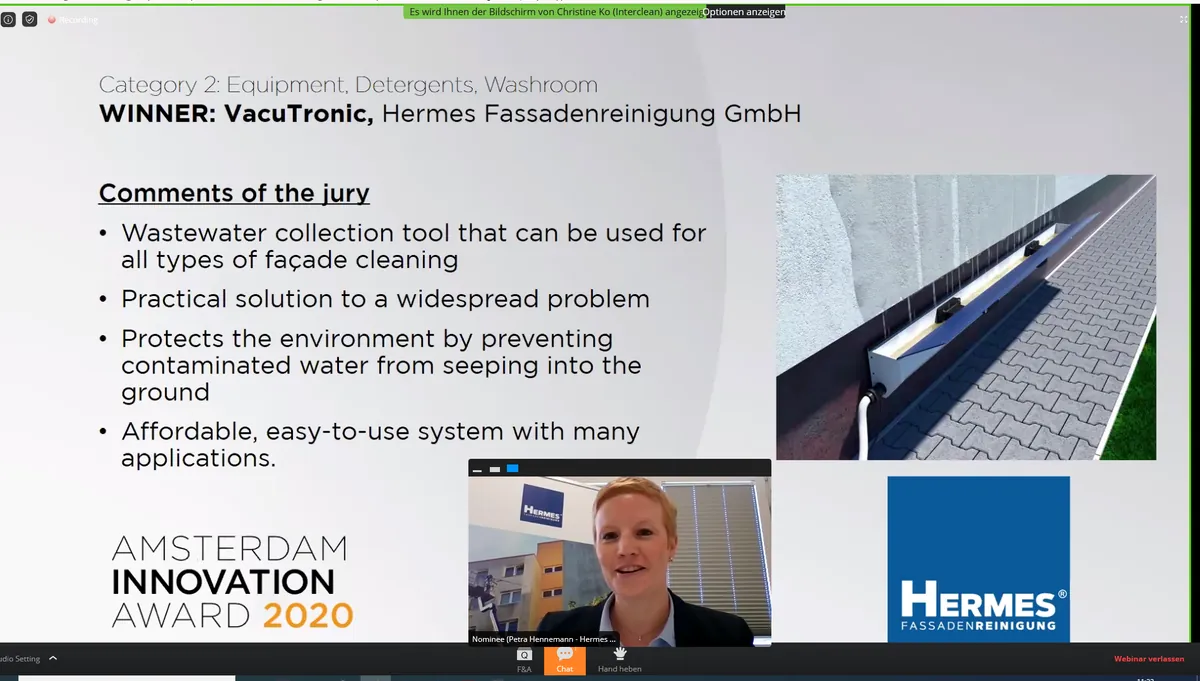 In der Kategorie Ausrüstung kam VacuTronic von Hermes auf Platz eins - eine Leiste, die durch Erzeugung eines Vakuums an der Wand befestigt wird. Sie fängt das Abwasser aus der Fassadenreinigung auf, so dass es nicht im Boden versickert. Weitere Nominierte in dieser Kategorie waren ein zu 100 Prozent recycelbarer Nachfüllbeutel für Reinigungschemie von Green Care Professional /Werner & Mertz und ein Solarmodul aus der Reinigungswagenreihe Opera von TWT.