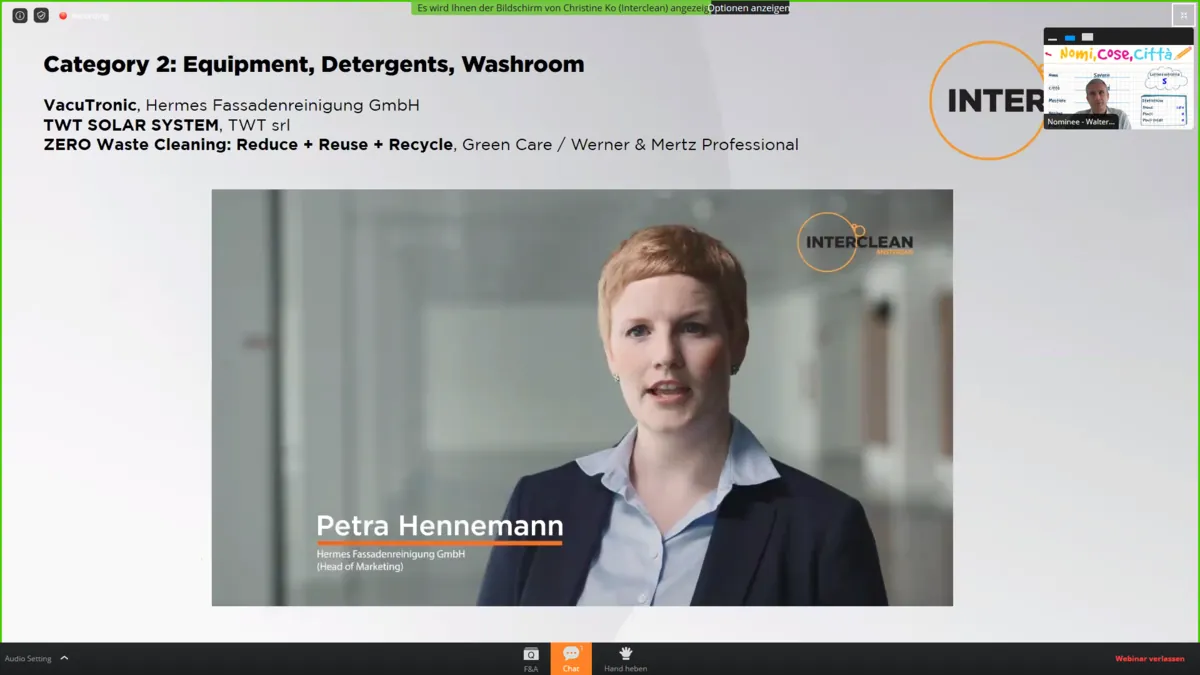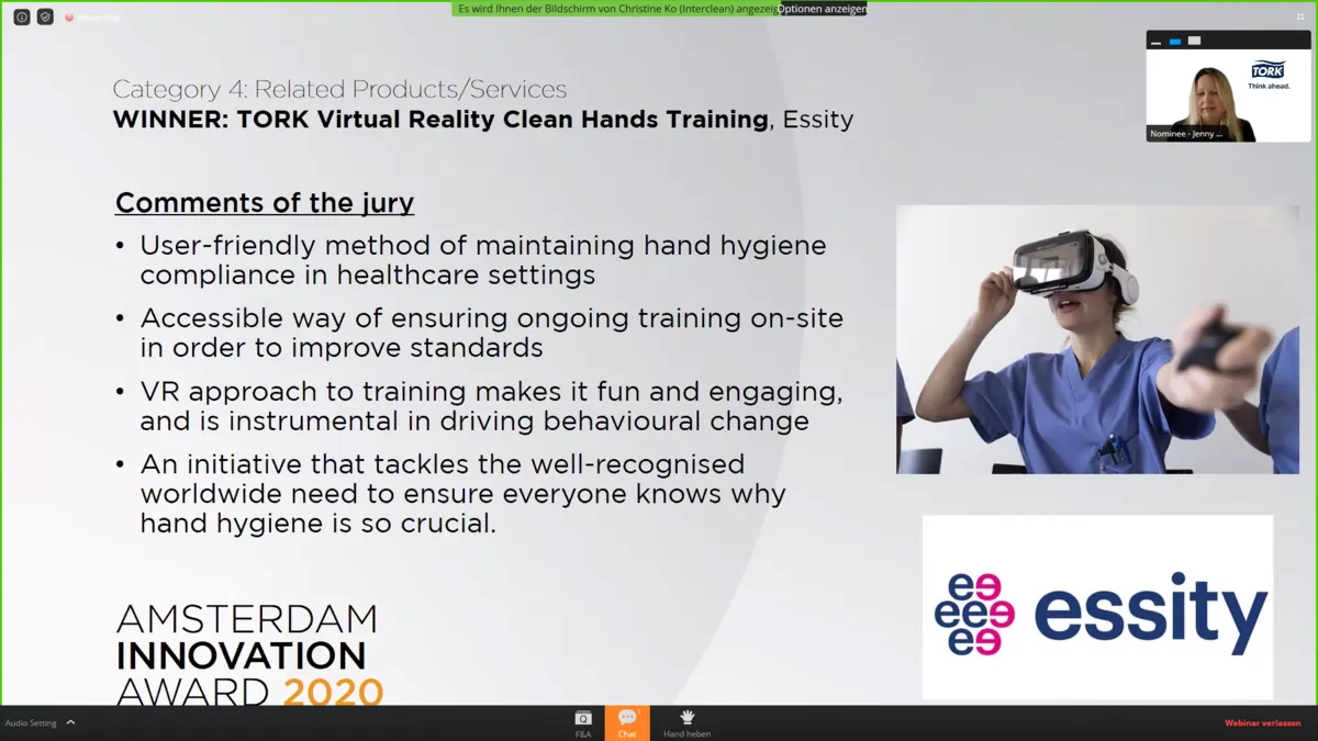 In der Kategorie Zugehörige Produkte/Dienstleistungen kam das Virtual-Reality-Training „Saubere Hände“ von Tork/Essity auf Platz eins. Zugeschaltet bei der Online-Preisverleihung: Jenny Logenius (oben rechts).