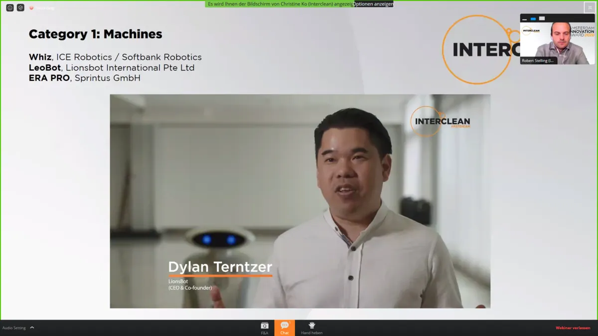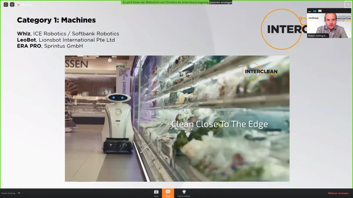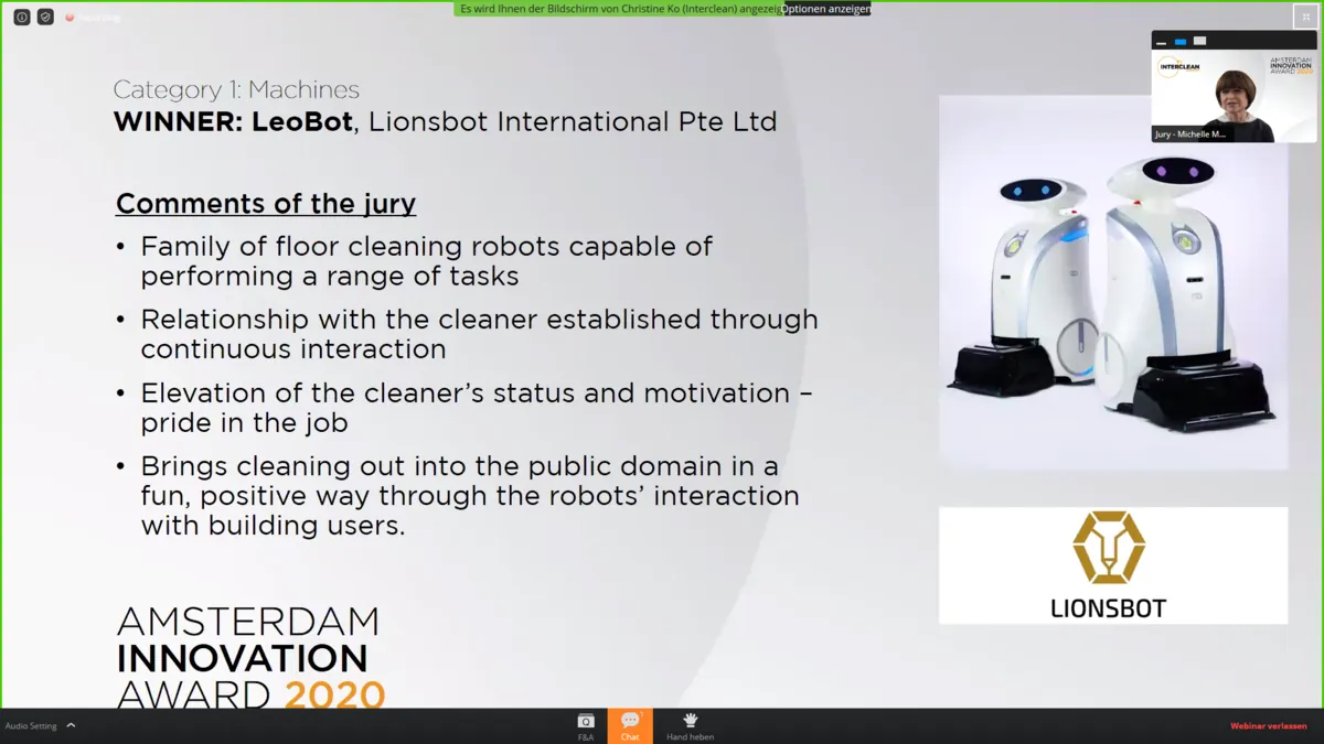 Bereits im Mai waren die Sieger der vier Wettbewerbskategorien ausgezeichnet worden - wegen der Corona-Pandemie ebenfalls im Rahmen eines Online-Events (Impressionen zeigt die Bildergalerie unten). In der Kategorie Maschinen siegte Leobot. Es handelt sich um eine Gruppe von Bodenreinigungsrobotern, die nicht nur saugen, wischen oder scheuern, sondern auch singen, tanzen, Witze erzählen oder auf andere Art mit der Umwelt interagieren können. Nominiert in der Kategorie Maschinen waren außerdem der intelligtene Trockensauger Era Pro von Sprintus und der Saugroboter Whiz von ICE Robotics/Softbank Robotics.