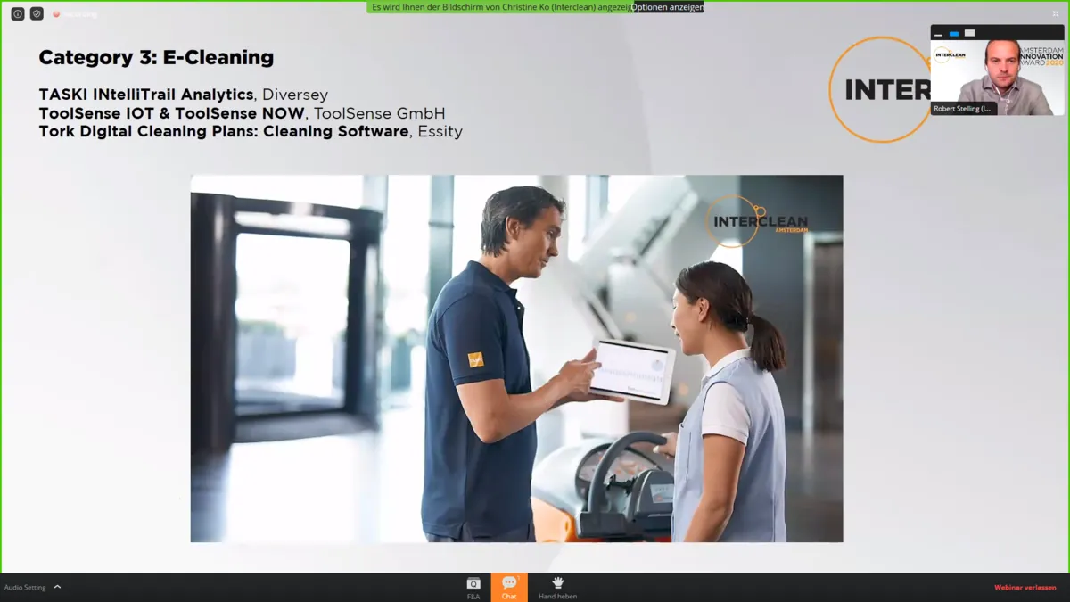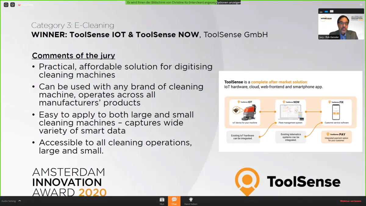 IOT & Now von ToolSense siegte in der Kategorie E-Cleaning. Das System zielt darauf ab, einen nicht optimalen Maschineneinsatz oder -ausfall zu vermeiden. Es setzte sich gegen das webbasierte Flottenmanagement-Tool IntelliTrail Analytics von Taski/Diversey und die Reinigungsmanagement-Software Digital Cleaning Plans von Tork/Essity zur Digitalisierung von Reinigungsroutinen durch.