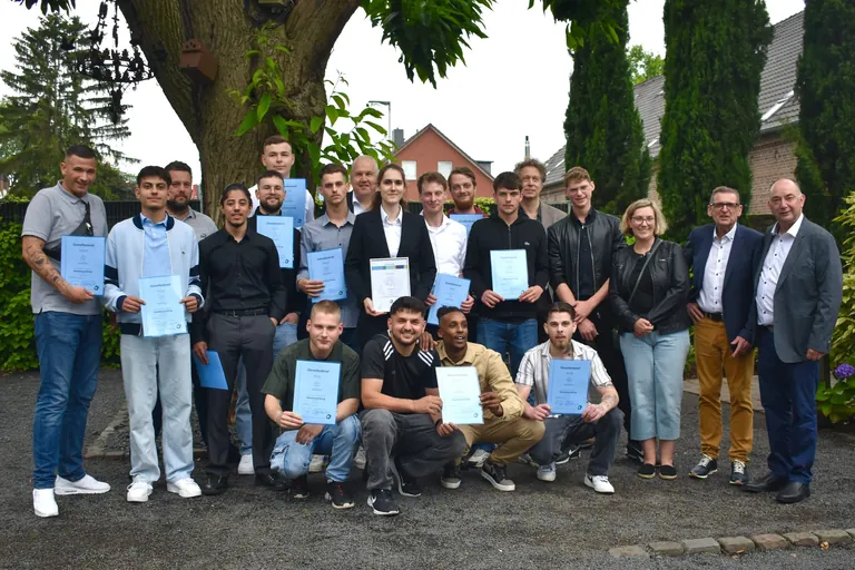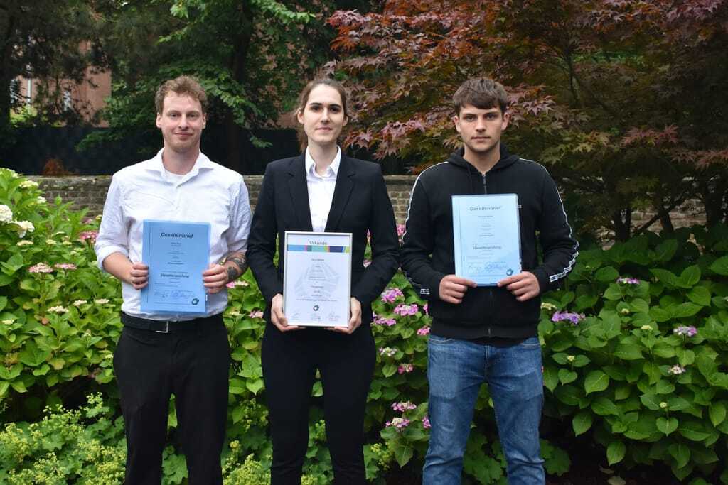Lehrlingswart Siegfried Ruhkamp und Gesellenprüfungsausschuss-Vorsitzender Manfred Lindgens überreichten den neuen Gesellen ihre Gesellenbriefe. Die drei Prüfungsbesten Laura Weber, Philipp Müller und Timo-Sven Melcher erhielten im Namen des diesjährigen Sponsors, Peter Kebeck in Stolberg, ein Geschenk. Dieses übergab Frank Wielens. Bei einem rustikalen Barbecue-Buffet ließen es sich anschließend alle Gäste schmecken. /ARO