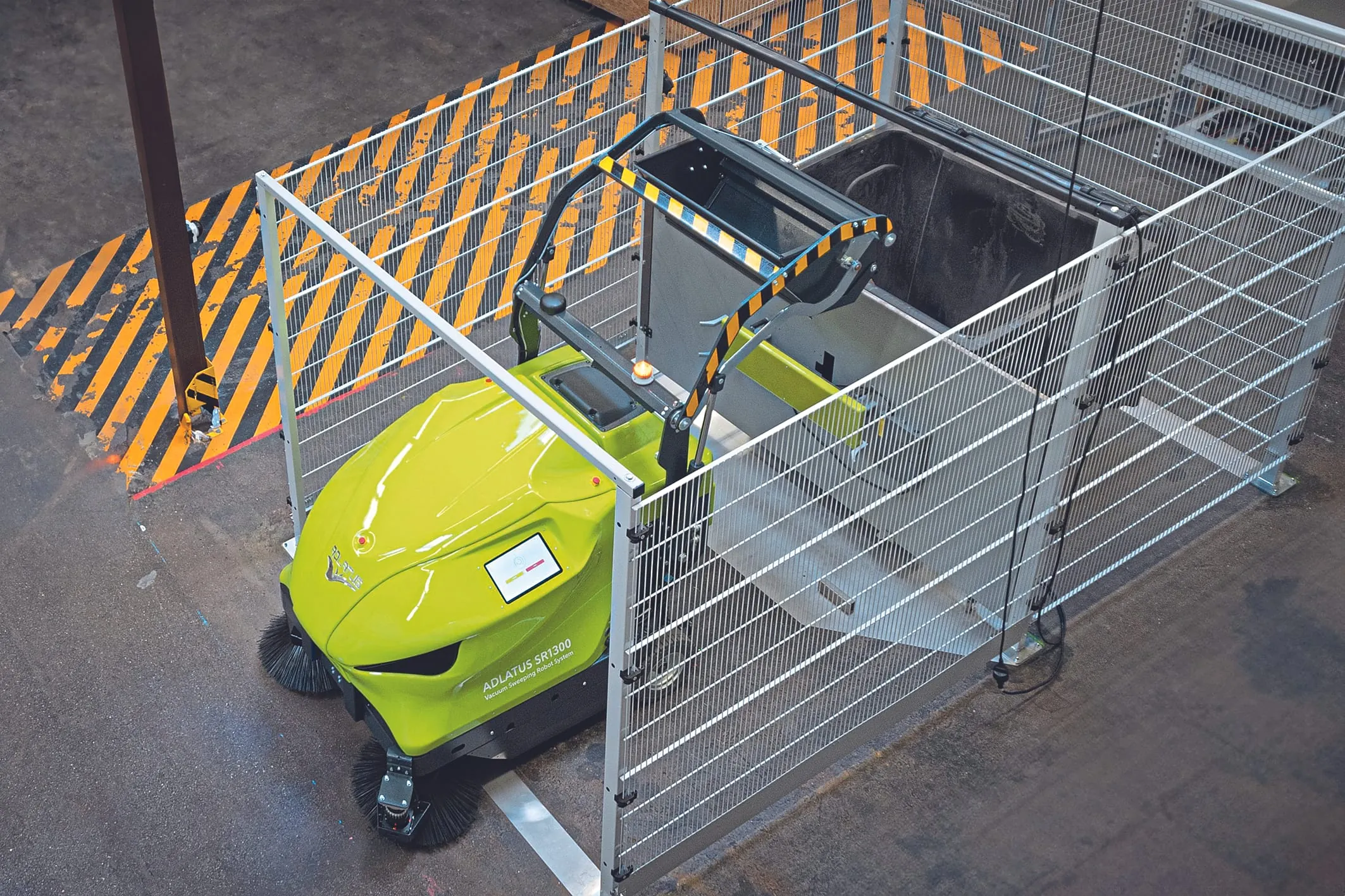 Das "Adlatus SR1300 Sweeping-Robot-System" mit vollautonomer ­Servicestation mit Akkuladung und vollautomatischer Höhenentleerung des Abfallbehälters.