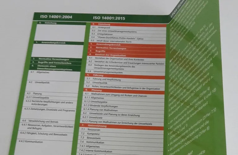 Unternehmen, die die neue Norm ISO 14001:2015 umsetzen möchten, können sich so schnell und einfach einen Überblick über die Änderungen verschaffen. Die Normenabschnitte der ISO 14001:2004 wurden in die neue ISO 14001:2015 „übersetzt“. In der aufklappbaren Innenseite ist ein Vergleich der Versionen ISO 14001:2004 mit der aktuellen Version von ISO 14001:2015 dargestellt.