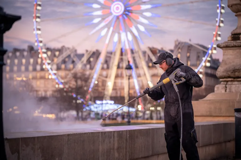 Mit einem Heißwasser-Hochdruckreiniger in der schonenden Dampfstufe befreiten die Experten von Kärcher die Kalkstein-Treppe im Herzen von Paris von biologischem Bewuchs und Emissionsverschmutzungen. Da vor Ort die Verfügbarkeit von Wasser und Strom eingeschränkt war, kamen zwei autarke Heißwasser-Hochdruck-Trailer zum Einsatz, die dank einem eigenen Tank für Wasser und einem integrierten Motor ohne Strom- und Wasseranschluss betrieben werden können. "Wichtig war, dass wir mit einem geringen Aufpralldruck von nur 0,5 bis 1 bar und hauptsächlich mit Wasserdampf gearbeitet haben", erklärt Nick Heyden, der die Durchführung des Projektes verantwortete.