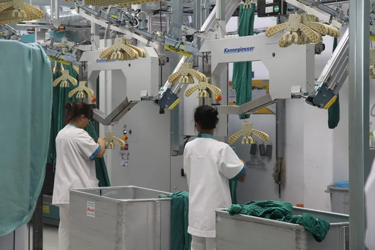 Der Bereich Formteile und damit das gesamte Sortiment an Bekleidung - Berufsbekleidung ebenso wie über OP-Wäsche oder Bewohnerwäsche - macht einen großen Teil der in der Wäscherei in Blaichach bearbeiteten Textilien aus. Je nach Wäschesorte müssen die Textilien nach dem Waschvorgang bestimmte Prozesse durchlaufen. Dazu gehören unter anderem Finishen und automatisches Falten.