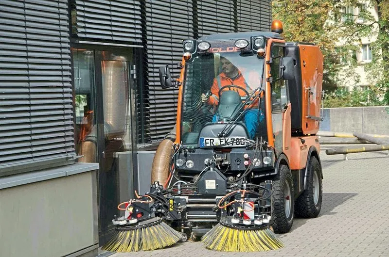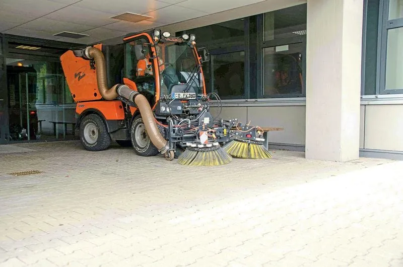 Am späten Nachmittag verlassen die letzten Schüler das Gelände des Droste-­Hülshof-Gymnasiums im Freiburger Stadtteil Herdern. An der Zufahrt steht ­Branko ­Sestak mit seinem Holder C 250 und blinkendem Warnlicht bereits auf Startposition. Gleich wird der Mitarbeiter des Dienstleisters FeSo das Kehrfahrzeug über das weitläufige Areal aus Wegen und Plätzen steuern. Der C 250 ist mit der Kehr-Saug-Kombination Easy Clean von Kugelmann ausgerüstet: Ein frontseitiges Anbaugerät mit zwei rotierenden, horizontal wie vertikal beweglichen Bürsten, inklusive Ansaugeinheit und einem huckepack mitgeführten Sammelbehälter.