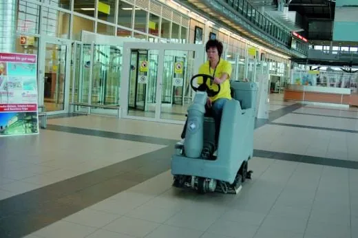-Das moderne Gebäude wird von der RB Glas- und Gebäudereinigung GmbH in Schuss gehalten – mit Erfolg, wie man bereits beim Betreten der Flughallenhalle sieht. Komplett mit Feinsteinzeugfliesen ausgelegt, sind in dieser Halle neben den Check-in-Schaltern und Sanitäreinrichtungen unter anderem auch der Airport Shop und ein V.I.P.-Raum untergebracht. „Die Farbe des Bodenbelages, der sich auch in den Sanitäreinrichtungen, den Shops und im Restaurant findet, soll das Wasser und den Sand der Ostsee widerspiegeln. Wir reinigen diese Fläche von rund 10.000 m2 dreimal wöchentlich komplett mit einem Scheuersaugautomaten, nur am Randbereich wird vorgemoppt“, erklärt Uwe Schomann, Bereichsleiter der RB Glas- und Gebäudereinigung.