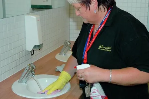 Sensibel ist natürlich auch die Reinigung der Sanitärräume zu handhaben. Durch den permanenten Gebrauch ist die Gefahr, dass Toiletten verunreinigt hinterlassen werden, jederzeit gegeben. Regelmäßige Kontrollgänge sind daher für die RB-Reinigungskräfte so selbstverständlich wie die sorgfältige Reinigung zur Sicherung der Hygiene. Mit dem gebrauchsfertigen Sanitärunterhaltsreiniger Sprinter Sanicid ist das schnell und mühelos zu erledigen. „Es gibt kaum eine Verschmutzung im Sanitärbereich, die wir mit diesem Reiniger nicht in den Griff kriegen“, macht Uwe Schomann deutlich. Dennoch sind von Zeit zu Zeit Grundreinigungen vorgeschrieben. Hier greift der Dienstleister RB auf das Tana-Produkt BR 75 zurück, das nicht nur keimreduzierend wirkt und Ablagerungen wie Kalk, Urin oder Rost entfernt, sondern auch die Beschädigung von Armaturen ausschließt. „Voraussetzung ist natürlich, dass die Verchromung noch intakt ist“, beschreibt Axel Jürgens, Außendienstmitarbeiter Tana, die Wirkungsweise dieses Reinigers.