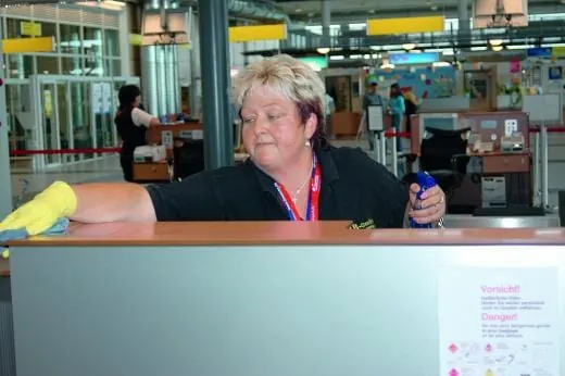 Aufrechterhalten wird die Sauberkeit im Flughafen aber auch durch die Sichtreinigung, die der Dienstleister für die öffentlichen Flächen durchführt. „Wir haben natürlich einen genauen Reinigungsplan, im öffentlichen Bereich arbeiten wir aber vor allem ergebnisorientiert. Das heißt, unsere Mitarbeiter haben über die standardmäßig anfallenden Arbeiten hinaus immer ein Auge auf Spontanverschmutzungen, die sie dann immer sofort entfernen“, erklärt Uwe Schomann. Zwischen 6 Uhr und 20 Uhr sind die RB-Mitarbeiter daher ständig im Einsatz, bei Bedarf, etwa bei Verspätungen oder in der Ferienzeit bei dichtem Flugaufkommen, wird natürlich auch länger gearbeitet. Drei Mitarbeiter sind für das Objekt im Einsatz, dazu kommen zwei so genannte Springer, die vor allem am Wochenende sowie in der Urlaubszeit und bei Krankheitsfällen mit eingesetzt werden. Alle Mitarbeiter sind natürlich sicherheitsüberprüft und mit entsprechenden Ausweisen ausgestattet.