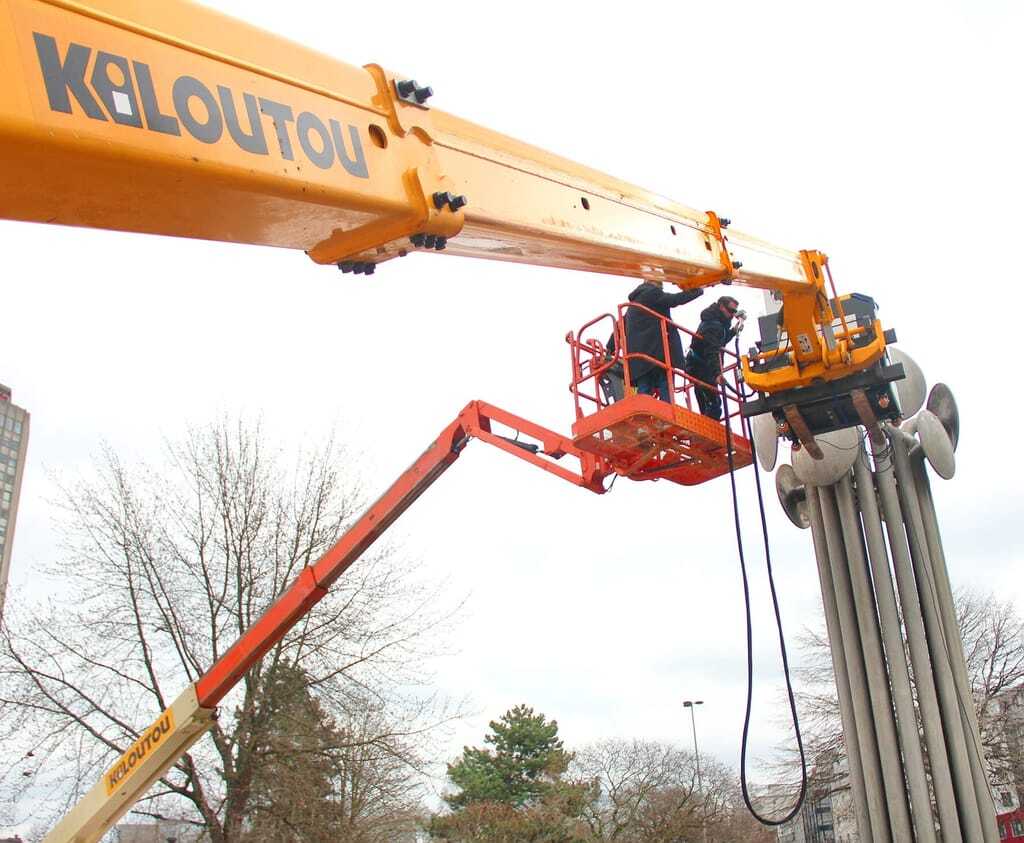 Gereinigt wird aus rund 40 cm Entfernung, so lang ist der Laserstrahl. Geführt wird er vom Anhänger mit Lasergenerator zum Einsatzort durch ein stabiles Glasfaserkabel. Durchaus aufwändig bei der 9 m hohen Kölner Brunnenplastik und ohne flexible Hebetechnik nicht zu stemmen. Dafür holte sich Effizient! Kiloutou mit ins Boot, und zwar in Form einer Gelenkteleskoparbeitsbühne sowie eines Teleskopstaplers.