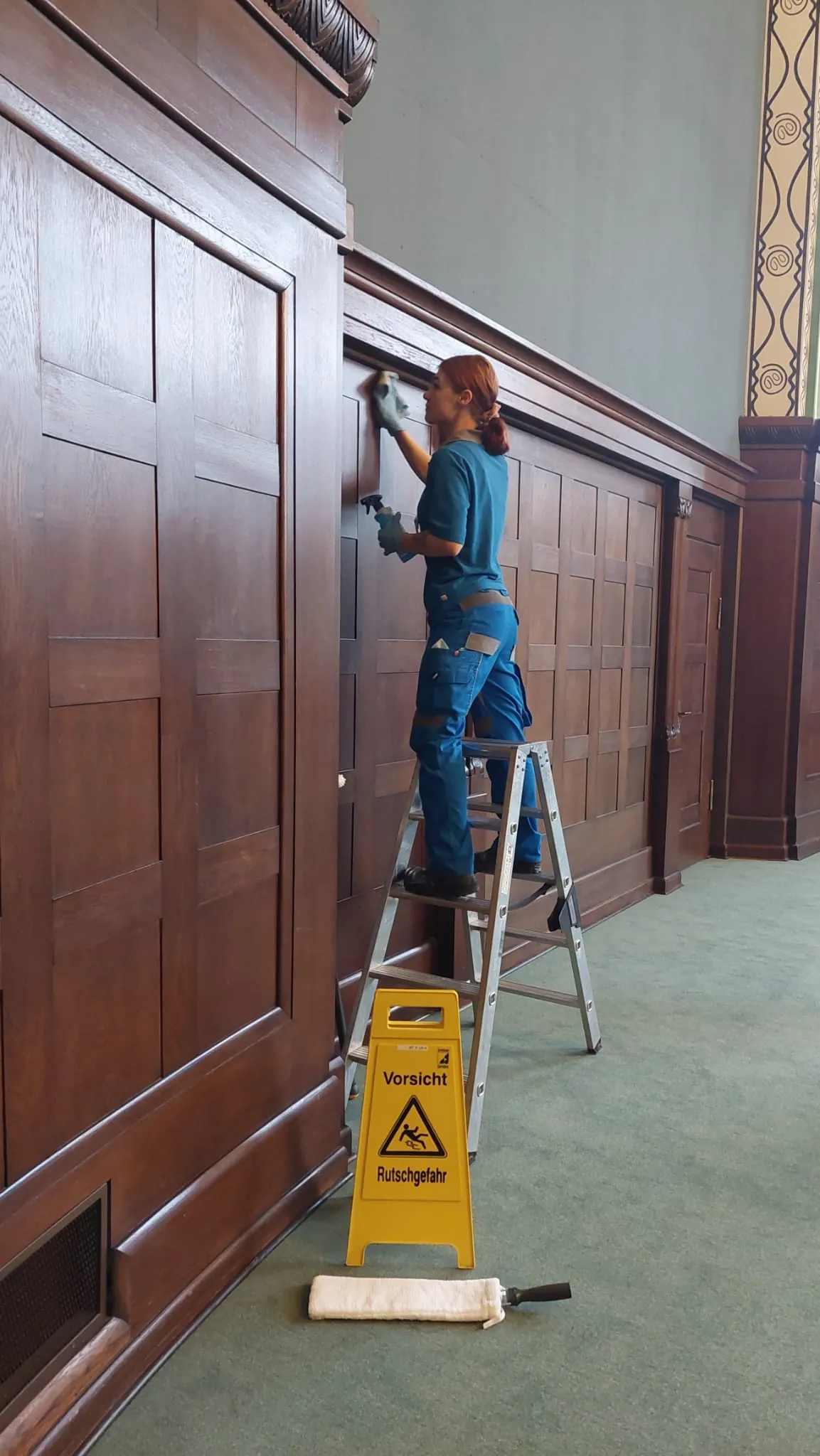 Materialkenntnis, Reinigungsgenauigkeit und Wissen im Umgang mit sensiblen Oberflächen waren gefragt beim Landeswettbewerb in der Sächsischen Staatskanzlei in Dresden. Hier bei der Arbeit: Jennifer Viand beim Reinigen der Holzvertäfelung im sogenannten Bienenkorb.