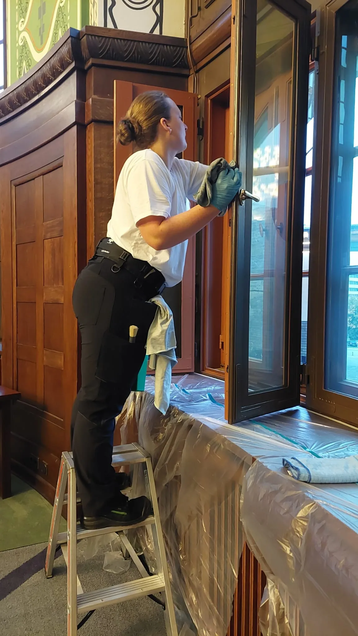 Die Reinigung der schusssicheren Fenster – hier ausgeführt von Lea-Marie Kosakow - erforderte Konzentration und Präzision bis ins Detail.