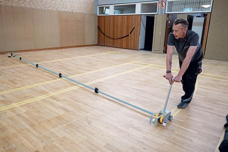 Dr. Schutz, spezialisiert auf Bodensanierung, bringt mit Floor und Sport Liner eine Neuheit auf den Markt, mit der sich Abklebearbeiten auf Hartböden nach Unternehmensangaben schnell und präzise erledigen lassen. Der Boden wird einfach abgefahren, wobei zwei parallell laufende Rollen das Klebeband in gleichmäßigem Abstand auf die Fläche bringen. Geraden oder Rundungen mit wählbarer Breite und einem Radius von bis zu neun Metern werden so in einem Arbeitsgang abgeklebt. Spielfeldmarkierungen, symmetrische Muster oder aufwendige Designs werden in einem Bruchteil der Zeit fertig. Auch farbenfrohe Symbole werden schnell und präzise aufgebracht. Der große Lieferumfang ermöglicht für jede Anwendung und jeden Einsatzbereich die passende Funktion.