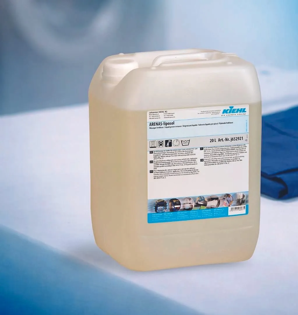 Mit Arenas-liposol erweitert Kiehl sein Textilwaschsortiment um einen flüssigen Fettlöser und Spezialadditiv. Das Produkt wurde gezielt für Anwender entwickelt, die täglich mit hartnäckigen Fett- und Ölverschmutzungen konfrontiert sind, insbesondere in Lebensmittelbetrieben, Hotels sowie in Industrie- und ­Gebäudereinigung.
