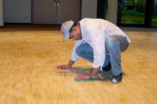 Im Veranstaltungssaal des Gastgebers, dem Saal „Barbara“, galt es, den Parkettboden zunächst abzuschleifen und später neu zu beschichten. Hierbei kam es insbesondere auf die Handhabung der Maschinen und die Gleichmäßigkeit des Ergebnisses an. Der kreisförmig verlegte Parkettboden im Zentrum des Saales wurde einer Trockensanierung unterzogen. Die Fläche wurde gleichmäßig unter Verwendung spezieller blauer Pads bearbeitet, um die vorhandene aufgebrachte Schutzschicht zu entfernen. Nach Bearbeitung der Oberfläche wurde der anfallende feine Holzstaub gründlich entfernt, um für die weiteren Arbeitsgänge entsprechende Voraussetzungen zu schaffen. Das Parkett zeigte sich nun im Rohzustand und auf die gesamte Fläche sollte eine neue Einpflege in zweifacher Ausführung aufgebracht werden. Zur Einpflege selbst mussten alle Kandidaten mit Hand anlegen, um die Fläche gleichmäßig deckend und zügig zu bearbeiten. Als Ergebnis stand eine schöne matt glänzende Oberfläche des Parketts, die dem Raum eine eigene optisch abgerundete Note verlieh. Prüferin Susanne Selbrede und Prüfer Norbert Jung sowie alle Wettbewerbsteilnehmer freuten sich über das gute Ergebnis, das ohne nennenswerten Chemieeinsatz (Grundreiniger usw.) erzielt wurde.
