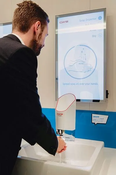 „Als moderner Systemanbieter fokussieren wir uns auf mehr als nur Produkte“, sagt Thomas Schmidt, CEO der CWS-boco International GmbH, wie der neu aufgebaute Geschäftsbereich belegt, der sich speziell um die Entwicklung ganzheitlicher Waschraumlösungen kümmert. So sorgt das Unternehmen schon beim Betreten des Testlabors für ein positives Erlebnis beim Nutzer, indem den Besuchern anzeigt wird, welche Kabine frei und frisch gereinigt ist. Hinzu kommen Türen ohne Klinken, die sich berührungslos öffnen lassen, Wände, die mit einer antibakteriellen Oberfläche versehen sind, und ein Modul im Spiegel, das anzeigt, wie lange die Hände einzuseifen, abzuspülen und abzutrocknen sind. Ein digitaler Wasserhahn gibt Wasser und Seife bereits fertig angemischt aus. Diese Technologien fördern laut CWS-boco eine bessere Händehygiene, indem eine Schulungskomponente und die automatische Nutzung von Seife in den Händewaschprozess integriert werden.