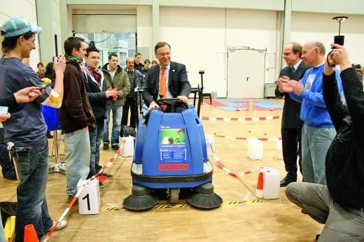 Das Vorbereitungsteam unter der Leitung von Marion Presek, Lehrlingswartin der LI und im Vorstand des BWNG, hatte sich viel einfallen lassen: Auf 150 m² Fläche wurden Informationen ebenso wie pfiffige Mitmachaktionen geboten. Eine spielerische Atmosphäre, Geschick und Schnelligkeit waren gefordert: Unter dem Motto „Reinigungs-Dreikampf“ zeigten Auszubildende auf sportliche Weise, welches technische Know-how das modernde Dienstleistungshandwerk heute nutzt. Davon konnte sich selbst der Oberbürgermeister der Stadt Hannover auf seinem Messerundgang überzeugen. Stephan Weil steuerte nach kurzer Einweisung durch Manfred Buttke von Columbus Reinigungsmaschinen eine Aufsitzkehrmaschine durch den Parcours. Einer Journalistin sagte er in einem anschließenden Interview, dass er einen „Riesenrespekt vor diesem Beruf“ hat, der „sehr viele schwierige Aufgaben und gefährliche Einsatzorte“ mit sich bringe. Dass es ein Ausbildungsberuf ist, wusste er auch. Für das Gewerk gilt es, dieses Wissen in die Öffentlichkeit und Schulen zu tragen. Dazu dienen die Ausbildungsmessen und Besuche der Lehrlingswartin in den allgemeinbildenden Schulen.