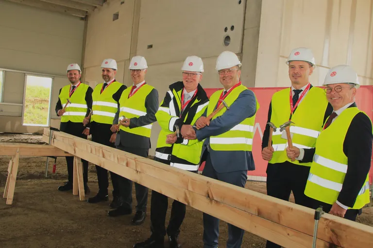Beim Richtfest haben Ulrich Schmidt, Vorstand Produktion & Logistik der Mewa-Gruppe, sowie Bürgermeister Alexander Schröder zusammen mit weiteren Vertretern der Mewa-Gruppe den symbolischen letzten Nagel ins Gebälk des neu errichteten Gebäudes geschlagen.