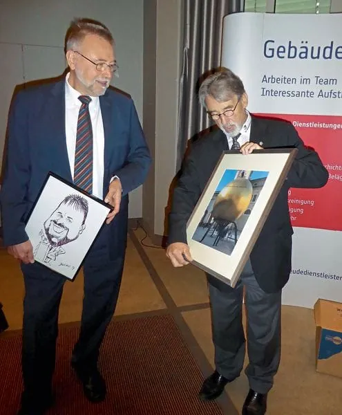 Auch als öffentlich bestellter Sachverständiger und Mitglied des Kompetenzteams Gebäudereinigung sowie in zahlreichen weiteren Positionen setzte er sich für die Belange des Gebäudereiniger-Handwerks ein. Er engagierte sich unter anderem für die Erstellung der Broschüre „Bauplanung und Reinigungstechnik“, die Auftrag­gebern und Architekten Hinweise zur reinigungsgerechten Bauplanung gibt, sowie für die Vergabeseminare, in denen er Auftrag­geber über ­Kalkulation und Plausibilitätsprüfung bei Ausschreibungen informierte. Im Namen des Vorstands dankte der stellvertretende Obermeister Jürgen Volz Manfred Schmidt für sein lang­jähriges Engagement und die vertrauensvolle Zusammenarbeit. Auch Innungsgeschäftsführer Detlef Stange gratulierte und überreichte ein Bild mit dem Titel „Er stemmte 25 Jahre die Landesinnung“. Detlef Stange und Manfred Schmidt arbeiten seit 25 Jahren zusammen – fünf Jahre in der Innung Frankfurt/Wiesbaden und 20 Jahre in der Landesinnung Hessen.