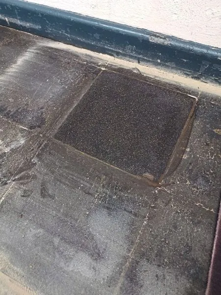 Unvollständig entfernte alte Beschichtung auf einem Gussasphaltboden.