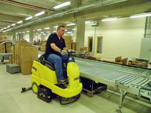 Die Reinigung erledigt effizient die Aufsitz-Scheuersaugmaschine B 90 R von Kärcher. Insbesondere nach Abholung bestellter Ware rund fünf vollgepackte Container verlassen jede Woche den Lagerkomplex wird der Hallenboden gründlich sauber gemacht. Vor der maschinellen Reinigung wird grober Schmutz eingesammelt, zum Beispiel bürstengefährdende Packbänder, Kartonagen oder Folien sowie Palettenbruch, kurz: alles, was die Scheuersaugmaschine nicht aufnehmen kann. Dann tritt die B 90 R zur Nassreinigung an. Die nur 80 cm breite und 145 cm lange Maschine durchfährt problemlos die schmalen Durchgänge zwischen den Rollenförderern und reinigt randnah bis zu den Paletten und Gitterboxen. Mit einem Wendekreis von 1,60 m lässt sie sich fast auf der Stelle drehen. Dank des Bürstenkopfes mit 75 cm breiten Walzenbürsten sind auch große Flächen, etwa die Stellbereiche der Container, rasch abgefahren. „Die Maschine ist leicht zu bedienen und reinigt sehr gründlich“, sagt Tony Shaffer, der für die ständige Sauberkeit der gesamten Fläche verantwortlich ist. „Außerdem sparen wir Zeit, weil wir dank eingebauter Kehrlade in einem Arbeitsgang kehren und saugen können.“