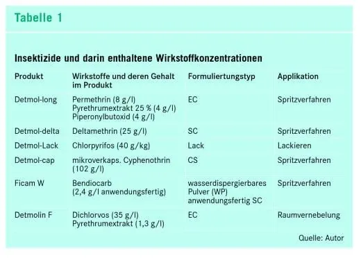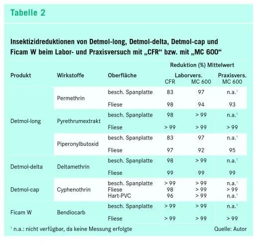 Die Bioindikationsversuche korrespondierten nicht mit den gewonnenen Ergebnissen der analytischen Untersuchungen. Möglicherweise besitzen die getesteten Produkte bereits in geringsten auftretenden Konzentrationen eine hohe zieltierspezifische Wirksamkeit oder es existierten andere Begleitumstände. Das mikroverkapselte Cyphenothrin (Kontakt- und Magengift; Anm. d. Red.) konnte mit dem „MC 600“ zu über 99 Prozent dekontaminiert werden.