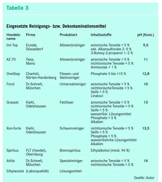 Tabelle 2 führt die analytischen Ergebnisse der Dekontaminationsversuche zusammenfassend vor Augen.